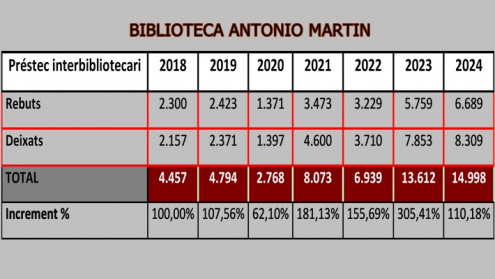 En el año de la pandemia, 2020, una recesión en el pino por razones obvias. Luego lleva de regreso a 2021 con casi el 200% del número total de transacciones. En 2022, el servicio de préstamos interbibliotecarios sufrió unos pocos meses por problemas técnicos. Aun así, mantiene el 155%. El aumento más notable ya será de 2022 a 2023. El servicio y la velocidad gratuitos para recibir y enviar solicitudes nos colocan en más de 13,000 documentos con un aumento de más del 300%. En 2024 se estabiliza, aunque con un aumento del 110% y casi 15,000 documentos, como se puede ver en la caja en la foto de la portada.